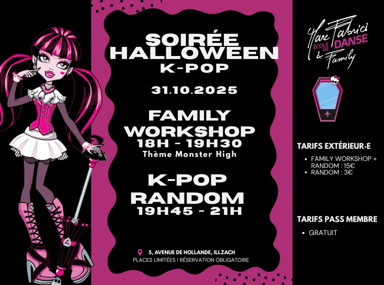18h00 – Family Workshop (1h30) : apprends une chorégraphie originale sur le thème Monster High et plonge dans l’univers d’Halloween dès les premières minutes 🧛♀️